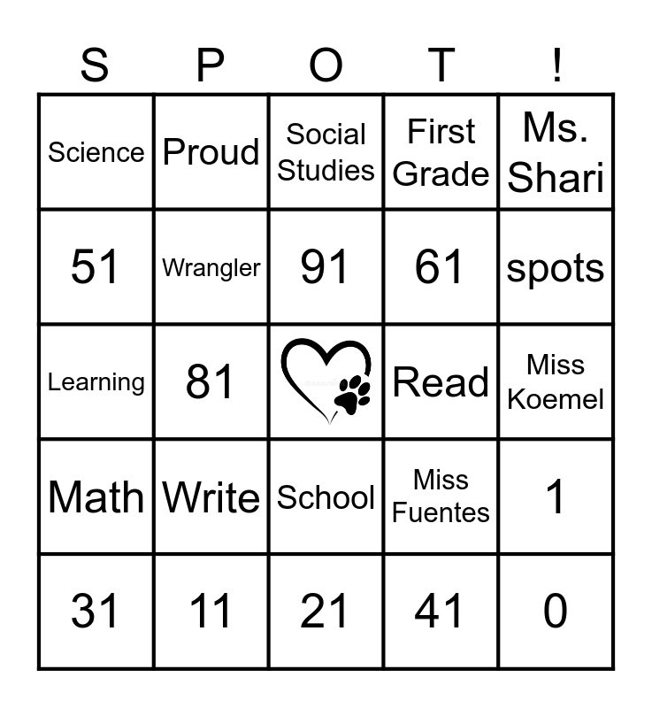 This bingo card has a free space and 28 words: 1, 71, 61, 41, 51, Social Studies, Proud, Math, Read, 31, Learning, First Grade, 11, 21, spots, Dalmatian, Write, Wrangler, 91, School, Science, 101, 0, 81, Miss Koemel, Miss Fuentes, Ms. Shari and Ms. Lawvere.