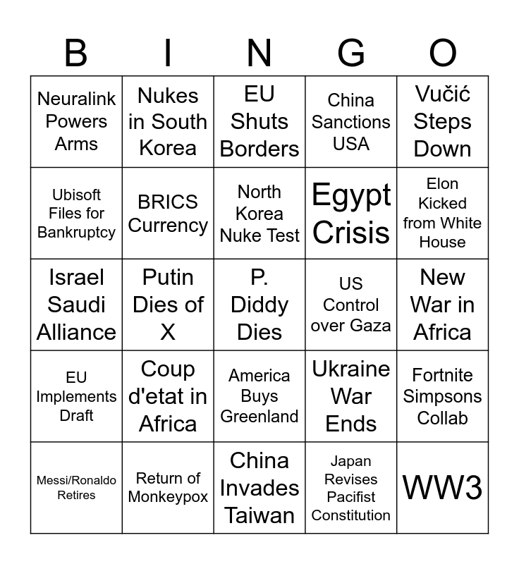 This bingo card has 25 words: Coup d'etat in Africa, China Invades Taiwan, North Korea Nuke Test, Messi/Ronaldo Retires, Vučić Steps Down, Neuralink Powers Arms, Ubisoft Files for Bankruptcy, Nukes in South Korea, US Control over Gaza, America Buys Greenland, Egypt Crisis, Israel Saudi Alliance, Ukraine War Ends, Fortnite Simpsons Collab, BRICS Currency, WW3, New War in Africa, EU Shuts Borders, Elon Kicked from White House, Putin Dies of X, P. Diddy Dies, Return of Monkeypox, EU Implements Draft, China Sanctions USA and Japan Revises Pacifist Constitution.