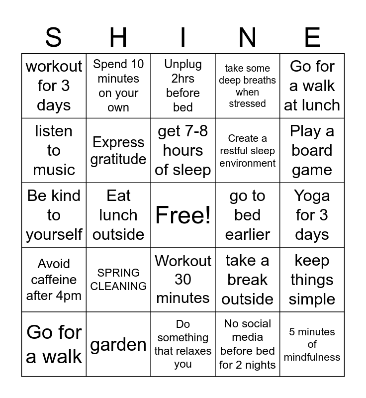 This bingo card has a free space and 24 words: SPRING CLEANING, garden, get 7-8 hours of sleep, Go for a walk, Go for a walk at lunch, workout for 3 days, listen to music, Spend 10 minutes on your own, go to bed earlier, Workout 30 minutes, Create a restful sleep environment, Be kind to yourself, take a break outside, keep things simple, Express gratitude, No social media before bed for 2 nights, Yoga for 3 days, Unplug 2hrs before bed, Play a board game, Eat lunch outside, 5 minutes of mindfulness, Avoid caffeine after 4pm, take some deep breaths when stressed and Do something that relaxes you.