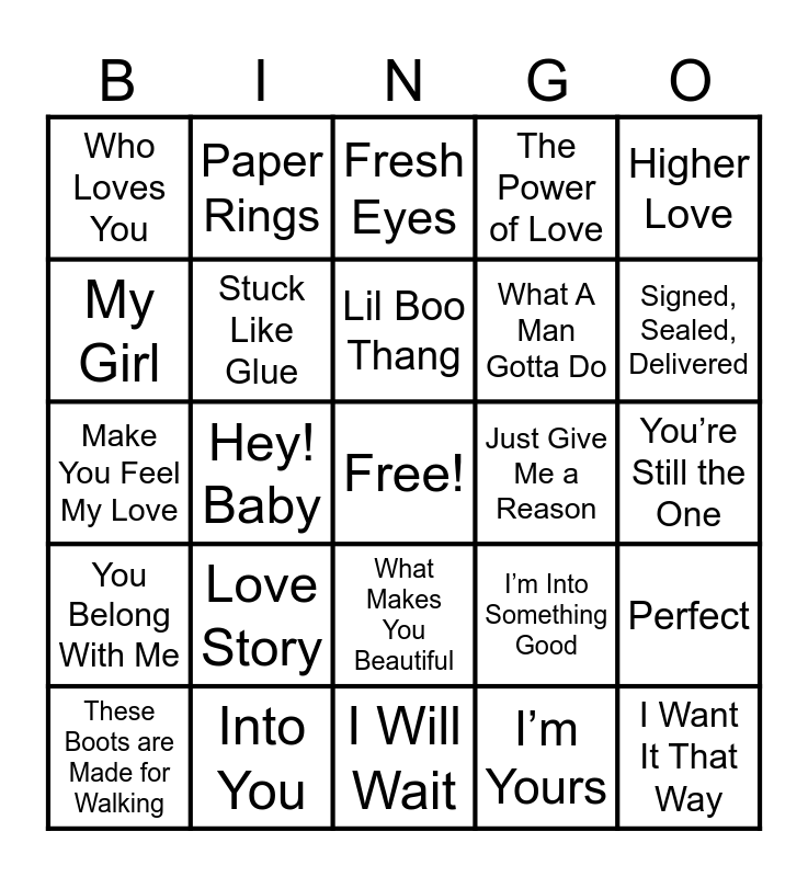 This bingo card has a free space and 56 words: Brandy (You’re a Fine Girl), These Boots are Made for Walking, Best of My Love, Who Loves You, I Will Wait, Say Hey (I Love You), Stuck Like Glue, Afternoon Delight, What A Man Gotta Do, Can’t Stop the Feeling, The Power of Love, Dance with Me Tonight, You’re the One That I Want, Love Will Keep Us Together, Dear Future Husband, Do You Love Me, Higher Love, Hey! Baby, How Will I Know, I Want It That Way, Just Give Me a Reason, Rhythm of Love, I’m Into Something Good, Fresh Eyes, Cupid Shuffle, Lil Boo Thang, I Can’t Help Myself, You Make My Dreams, Signed, Sealed, Delivered, Build Me Up Buttercup, I Like Me Better, Call Me Maybe, Starving, Lover, You’re Still the One, My Girl, Make You Feel My Love, It’s All Coming Back to Me Now, You Belong With Me, Paper Rings, What Makes You Beautiful, I Do, Fresh Eyes, I Wanna Dance with Somebody, Love Somebody, Love Story, Into You, Firework, Die A Happy Man, Classic, I’m Yours, Beautiful Things, Adore You, Favorite Crime, Perfect and Die With a Smile.