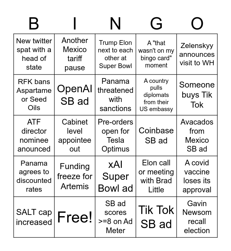 This bingo card has 30 words: Free!, Cabinet head appointee out, Cabinet level appointee out, DOGE clock hits 75bn, New twitter spat with a head of state, Trump Elon next to each other at Super Bowl, OpenAI SB ad, xAI Super Bowl ad, Coinbase SB ad, SB ad scores >=8 on Ad Meter, Avacados from Mexico SB ad, Pre-orders open for Tesla Optimus, Tik Tok SB ad, Gavin Newsom recall election, Someone buys Tik Tok, Panama threatened with military action, Elon call or meeting with Brad Little, Panama agrees to discounted rates, Funding freeze for Artemis, Zelenskyy announces visit to WH, ATF director nominee anounced, Another Canada tariff pause, Another Mexico tariff pause, A country pulls diplomats from their US embassy, RFK bans Aspartame or Seed Oils, A "that wasn't on my bingo card" moment, A covid vaccine loses its approval, SALT cap increased, Panama threatened with sanctions and Japan tarriffs.