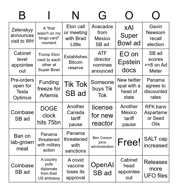 This bingo card has 37 words: Free!, Ben Carson joins administration, Cabinet head appointee out, Cabinet level appointee out, DOGE clock hits 75bn, New twitter spat with a head of state, Trump Elon next to each other at Super Bowl, OpenAI SB ad, xAI Super Bowl ad, Coinbase SB ad, SB ad scores >=8 on Ad Meter, Avacados from Mexico SB ad, Pre-orders open for Tesla Optimus, Tik Tok SB ad, Gavin Newsom recall election, Someone buys Tik Tok, Panama threatened with military action, Elon call or meeting with Brad Little, Panama agrees to discounted rates, Funding freeze for Artemis, Zelenskyy announces visit to WH, ATF director nominee anounced, Another Canada tariff pause, Another Mexico tariff pause, A country pulls diplomats from their US embassy, RFK bans Aspartame or Seed Oils, A "that wasn't on my bingo card" moment, A covid vaccine loses its approval, SALT cap increased, Panama threatened with sanctions, Japan tarriffs, license for new reactor, EO on Epstein docs, Ban on lab-grown meat, Coinbase SB ad, Establishes Bitcoin reserve and Releases more UFO files.