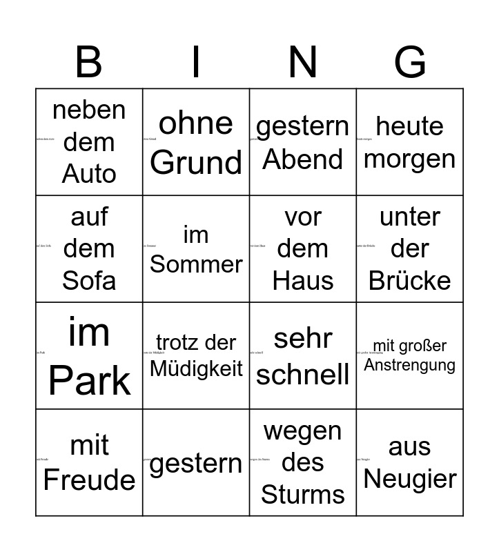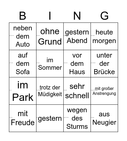 This bingo card has 16 images and 16 words: gestern, mit großer Anstrengung, gestern Abend, neben dem Auto, im Park, ohne Grund, sehr schnell, wegen des Sturms, auf dem Sofa, im Sommer, mit Freude, heute morgen, trotz der Müdigkeit, unter der Brücke, vor dem Haus and aus Neugier.