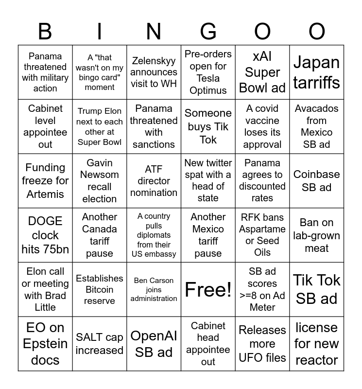 This bingo card has 36 words: Free!, Ben Carson joins administration, Cabinet head appointee out, Cabinet level appointee out, DOGE clock hits 75bn, New twitter spat with a head of state, Trump Elon next to each other at Super Bowl, OpenAI SB ad, xAI Super Bowl ad, SB ad scores >=8 on Ad Meter, Avacados from Mexico SB ad, Pre-orders open for Tesla Optimus, Tik Tok SB ad, Gavin Newsom recall election, Someone buys Tik Tok, Panama threatened with military action, Elon call or meeting with Brad Little, Panama agrees to discounted rates, Funding freeze for Artemis, Zelenskyy announces visit to WH, ATF director nomination, Another Canada tariff pause, Another Mexico tariff pause, A country pulls diplomats from their US embassy, RFK bans Aspartame or Seed Oils, A "that wasn't on my bingo card" moment, A covid vaccine loses its approval, SALT cap increased, Panama threatened with sanctions, Japan tarriffs, license for new reactor, EO on Epstein docs, Ban on lab-grown meat, Coinbase SB ad, Establishes Bitcoin reserve and Releases more UFO files.