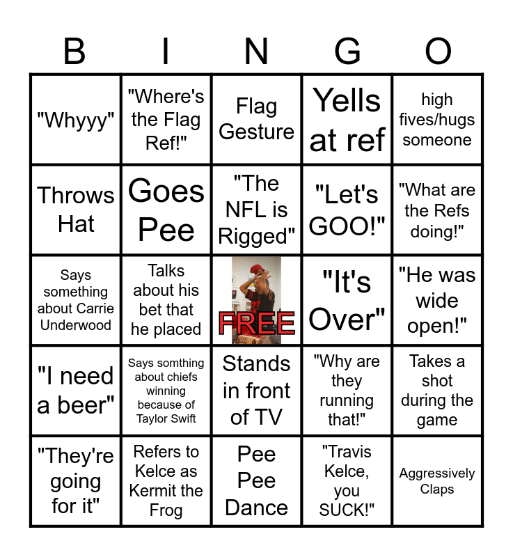 This bingo card has a free space and 24 words: Says somthing about chiefs winning because of Taylor Swift, Refers to Kelce as Kermit the Frog, "The NFL is Rigged", "They're going for it", high fives/hugs someone, "Whyyy", Throws Hat, "Where's the Flag Ref!", "It's Over", Stands in front of TV, "Let's GOO!", Says something about Carrie Underwood, "Why are they running that!", Takes a shot during the game, Goes Pee, "Travis Kelce, you SUCK!", "He was wide open!", Flag Gesture, "What are the Refs doing!", Talks about his bet that he placed, Aggressively Claps, "I need a beer", Yells at ref and Pee Pee Dance.
