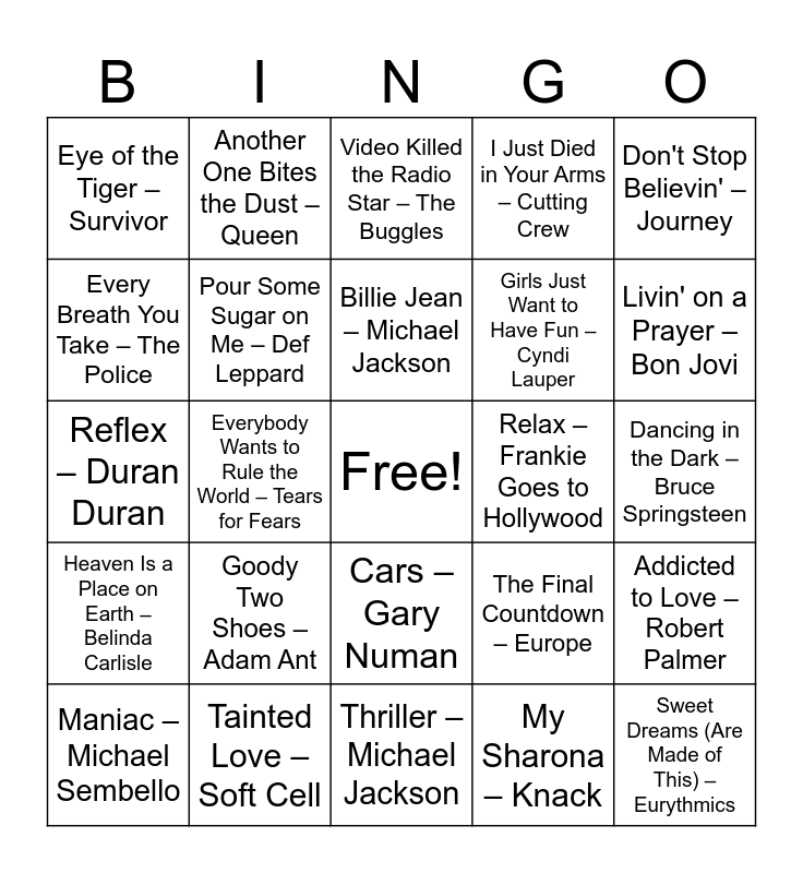 This bingo card has a free space and 64 words: 1999 – Prince, 8675309 – Jenny Jenny, 99 Red Balloons – NENA, Addicted to Love – Robert Palmer, Africa – Toto, Always Something There to Remind Me – Sandie Shaw, Another One Bites the Dust – Queen, Beat It – Michael Jackson, Billie Jean – Michael Jackson, Burning Down the House – Talking Heads, Cars – Gary Numan, Centerfold – The J. Geils Band, Dancing in the Dark – Bruce Springsteen, Don't Stop Believin' – Journey, Don't You Want Me – The Human League, Every Breath You Take – The Police, Everybody Wants to Rule the World – Tears for Fears, Eye of the Tiger – Survivor, Faith – George Michael, Girls Just Want to Have Fun – Cyndi Lauper, Goody Two Shoes – Adam Ant, Heaven Is a Place on Earth – Belinda Carlisle, I Just Died in Your Arms – Cutting Crew, I Love Rock 'n' Roll – Joan Jett & the Blackhearts, I Melt With You – Modern English, I Ran (So Far Away) – A Flock of Seagulls, I Want to Know What Love Is – Foreigner, Jessie’s Girl – Springfield, Jump – Van Halen, Karma Chameleon – Culture Club, Let's Dance – David Bowie, Let's Hear It for the Boy – Deniece Williams, Like a Prayer – Madonna, Like a Virgin – Madonna, Livin' on a Prayer – Bon Jovi, Maniac – Michael Sembello, Material Girl – Madonna, My Sharona – Knack, Never Gonna Give You Up – Rick Astley, Pour Some Sugar on Me – Def Leppard, Reflex – Duran Duran, Relax – Frankie Goes to Hollywood, Should I Stay or Should I Go – The Clash, Summer of '69 – Bryan Adams, Sweet Child o' Mine – Guns N' Roses, Sweet Dreams (Are Made of This) – Eurythmics, Tainted Love – Soft Cell, Take On Me – A-ha, The Final Countdown – Europe, The Power of Love – Huey Lewis and the News, The Safety Dance – Men Without Hats, The Way You Make Me Feel – Michael Jackson, Thriller – Michael Jackson, Time After Time – Cyndi Lauper, Under Pressure – Queen & David Bowie, Venus – Bananarama, Video Killed the Radio Star – The Buggles, Waiting for a Girl Like You – Foreigner, Wake Me Up Before You Go-Go – Wham!, Walk Like an Egyptian – The Bangles, Walk This Way – Run-D.M.C. & Aerosmith, Wanna Dance with Somebody (Who Loves Me) – Whitney Houston, With or Without You – U2 and You Spin Me Round (Like a Record) – Dead or Alive.