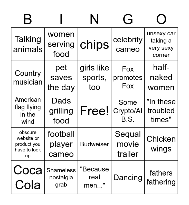This bingo card has a free space and 24 words: football player cameo, Shameless nostalgia grab, girls like sports, too, Coca Cola, unsexy car taking a very sexy corner, Talking animals, Country musician, women serving food, Some Crypto/AI B.S., Budweiser, Fox promotes Fox, American flag flying in the wind, Sequal movie trailer, Chicken wings, pet saves the day, Dancing, "In these troubled times", chips, half-naked women, Dads grilling food, fathers fathering, obscure website or product you have to look up, celebrity cameo and "Because real men...".