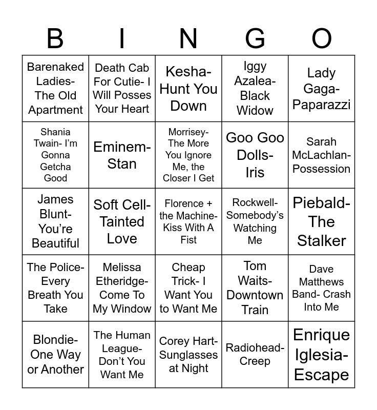 This bingo card has 28 words: Dave Matthews Band- Crash Into Me, Nirvana- Drain You, Goo Goo Dolls- Iris, Radiohead- Creep, Shania Twain- I’m Gonna Getcha Good, Kesha- Hunt You Down, Death Cab For Cutie- I Will Posses Your Heart, The Police- Every Breath You Take, Rockwell- Somebody’s Watching Me, Blondie- One Way or Another, James Blunt- You’re Beautiful, Iggy Azalea- Black Widow, The Human League- Don’t You Want Me, Corey Hart- Sunglasses at Night, Sarah McLachlan- Possession, Lionel Ritchie- Hello, Melissa Etheridge- Come To My Window, Eminem- Stan, Morrisey- The More You Ignore Me, the Closer I Get, Cheap Trick- I Want You to Want Me, Barenaked Ladies- The Old Apartment, Enrique Iglesia- Escape, Florence + the Machine- Kiss With A Fist, Soft Cell- Tainted Love, Piebald- The Stalker, Tom Waits- Downtown Train, Lady Gaga- Paparazzi and Plain White Ts- Hey There, Delilah.
