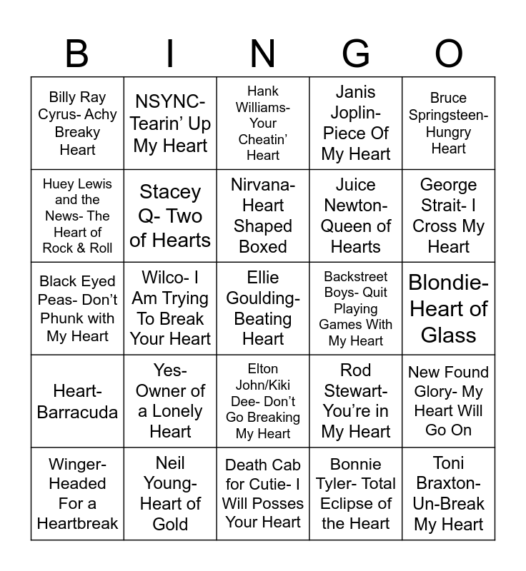 This bingo card has 26 words: Elton John/Kiki Dee- Don’t Go Breaking My Heart, Bonnie Tyler- Total Eclipse of the Heart, Nirvana- Heart Shaped Boxed, Neil Young- Heart of Gold, Bruce Springsteen- Hungry Heart, Billy Ray Cyrus- Achy Breaky Heart, Huey Lewis and the News- The Heart of Rock & Roll, NSYNC- Tearin’ Up My Heart, Blondie- Heart of Glass, Rod Stewart- You’re in My Heart, Juice Newton- Queen of Hearts, Black Eyed Peas- Don’t Phunk with My Heart, New Found Glory- My Heart Will Go On, Winger- Headed For a Heartbreak, Wilco- I Am Trying To Break Your Heart, Phil Collins- You’ll Be In My Heart, Janis Joplin- Piece Of My Heart, Heart- Barracuda, Hank Williams- Your Cheatin’ Heart, Ellie Goulding- Beating Heart, George Strait- I Cross My Heart, Death Cab for Cutie- I Will Posses Your Heart, Backstreet Boys- Quit Playing Games With My Heart, Yes- Owner of a Lonely Heart, Stacey Q- Two of Hearts and Toni Braxton- Un-Break My Heart.