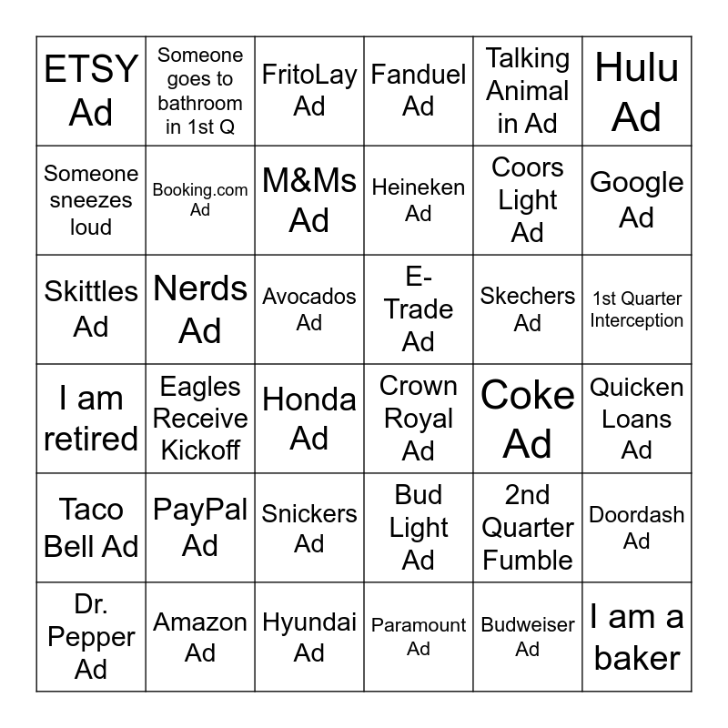 This bingo card has 90 words: 1st Quarter Field Goal, 1st Quarter Fumble, 1st Quarter Interception, 1st Quarter Penalty, 1st Quarter Punt, 1st Quarter Touchdown, 2nd Quarter Field Goal, 2nd Quarter Fumble, 2nd Quarter Interception, 2nd Quarter Penalty, 2nd Quarter Punt, 2nd Quarter Touchdown, Amazon Ad, Avocados Ad, BMW Ad, Booking.com Ad, Bud Light Ad, Budweiser Ad, Chiefs Receive Kickoff, Chiefs Score First, Coin Toss Land Tails, Coin Toss Lands Heads, Coke Ad, Colgate Ad, Coors Light Ad, Crown Royal Ad, Cutie Pie in the family room, Doordash Ad, Doritos Ad, Dove Ad, Dr. Pepper Ad, Eagles Receive Kickoff, Eagles Score First, E-Trade Ad, ETSY Ad, Fanduel Ad, FritoLay Ad, Gillette Ad, Google Ad, Heineken Ad, Honda Ad, Hulu Ad, Hyundai Ad, I am a baker, I am a teacher, I am retired, I am the oldest child, I was born after 1980, Jeep Ad, Kia Ad, Little Caesars Ad, M&Ms Ad, McDonalds Ad, Michelob Ultra Ad, Mountain Dew Ad, Movie Trailer, Nerds Ad, Nissan Ad, Oreo Ad, Paramount Ad, PayPal Ad, Peacock Ad, Pepsi Ad, Planters Ad, Pluto TV Ad, Popeyes Ad, Pringles Ad, Quicken Loans Ad, Reese's Ad, Rocket Mortgage Ad, Skechers Ad, Skittles Ad, Snickers Ad, Someone coughs loud, Someone goes to bathroom in 1st Q, Someone sneezes loud, Someone wears stripes, Sprint Ad, Squarespace Ad, Statefarm Ad, Taco Bell Ad, Talking Animal in Ad, Tide Ad, T-Mobile Ad, Toyota Ad, TurboTax Ad, Uber Eats Ad, Verizon Ad, Weather Tech Ad and Wendy's Ad.