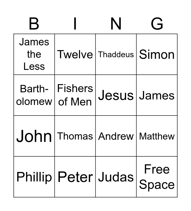 This bingo card has 16 words: Peter, Matthew, Thaddeus, James the Less, John, Twelve, Andrew, Judas, Barth-olomew, Fishers of Men, Phillip, Simon, Thomas, James, Jesus and Free Space.