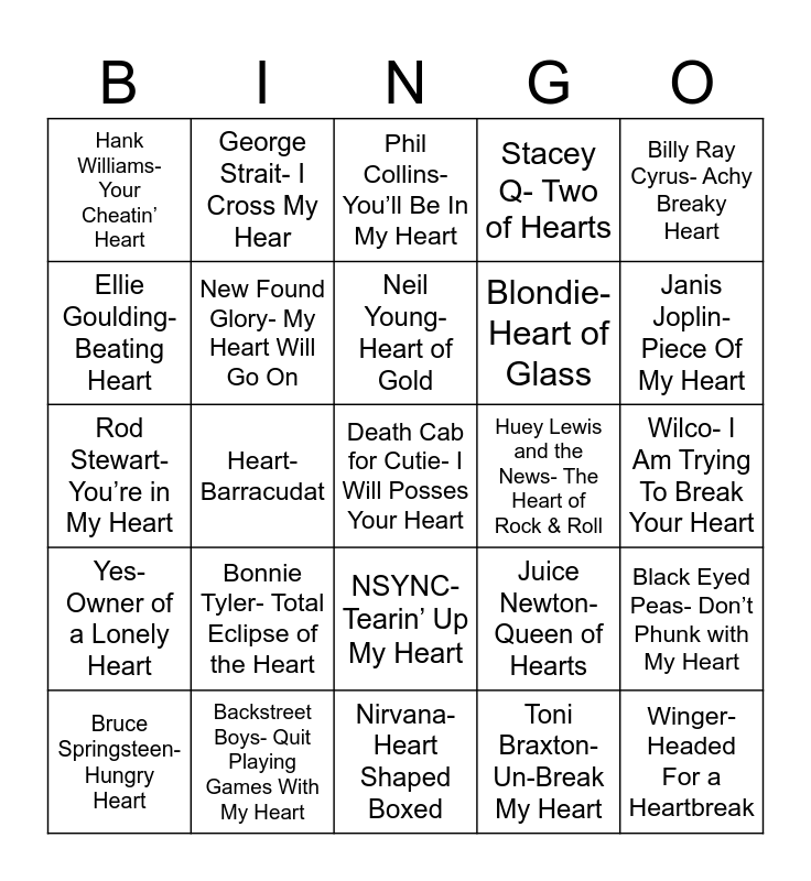 This bingo card has 25 words: Bonnie Tyler- Total Eclipse of the Heart, Nirvana- Heart Shaped Boxed, Neil Young- Heart of Gold, Bruce Springsteen- Hungry Heart, Billy Ray Cyrus- Achy Breaky Heart, Hank Williams- Your Cheatin’ Heart, Ellie Goulding- Beating Heart, George Strait- I Cross My Hear, Huey Lewis and the News- The Heart of Rock & Roll, NSYNC- Tearin’ Up My Heart, Blondie- Heart of Glass, Rod Stewart- You’re in My Heart, Juice Newton- Queen of Hearts, Black Eyed Peas- Don’t Phunk with My Heart, New Found Glory- My Heart Will Go On, Winger- Headed For a Heartbreak, Wilco- I Am Trying To Break Your Heart, Phil Collins- You’ll Be In My Heart, Janis Joplin- Piece Of My Heart, Heart- Barracudat, Death Cab for Cutie- I Will Posses Your Heart, Backstreet Boys- Quit Playing Games With My Heart, Yes- Owner of a Lonely Heart, Stacey Q- Two of Hearts and Toni Braxton- Un-Break My Heart.
