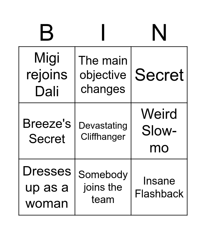 This bingo card has a free space and 8 words: Weird Slow-mo, Secret, The main objective changes, Dresses up as a woman, Migi rejoins Dali, Insane Flashback, Breeze's Secret and Somebody joins the team.