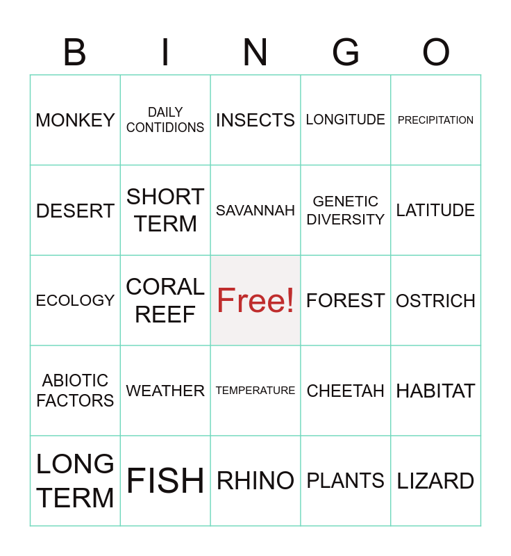 This bingo card has a free space and 24 words: WEATHER, FISH, SAVANNAH, LONG TERM, PRECIPITATION, MONKEY, DESERT, DAILY CONTIDIONS, FOREST, TEMPERATURE, GENETIC DIVERSITY, ECOLOGY, CHEETAH, HABITAT, SHORT TERM, PLANTS, OSTRICH, INSECTS, LATITUDE, CORAL REEF, LIZARD, ABIOTIC FACTORS, LONGITUDE and RHINO.