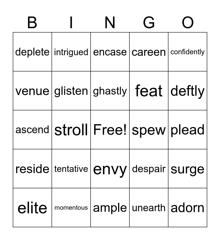 This bingo card has a free space and 24 words: tentative, momentous, ghastly, elite, confidently, deplete, venue, intrigued, spew, envy, feat, ascend, despair, surge, glisten, unearth, plead, encase, deftly, stroll, adorn, reside, careen and ample.