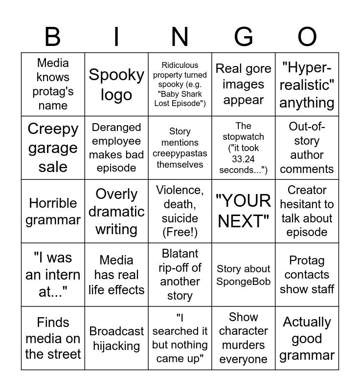 This bingo card has 40 words: Abrupt ending, Horrible grammar, References to unrelated media, Deranged employee makes bad episode, Broadcast hijacking, Blatant rip-off of another story, Story mentions creepypastas themselves, Needless satanic imagery, "Hyper-realistic" anything, "I was an intern at...", Overly dramatic writing, Real gore images appear, Violence, death, suicide (Free!), Creator hesitant to talk about episode, "YOUR NEXT", Media has real life effects, Protag ignores obvious red flags, Media knows protag's name, "I could never watch [media] again", Ridiculous property turned spooky (e.g. "Baby Shark Lost Episode"), Protag contacts show staff, Show character murders everyone, The stopwatch ("it took 33.24 seconds..."), Creepy garage sale, "Not like the other creepypastas", "Don't watch this" warning, Media predicts the future, Vomiting, Actually good grammar, Protag dies during story, Suspicious extra track on DVD, Finds media on the street, VHS for a modern show, Story about SpongeBob, Out-of-story author comments, "I searched it but nothing came up", "I used to love [X]", eBay, Spooky logo and Random foreign languages.