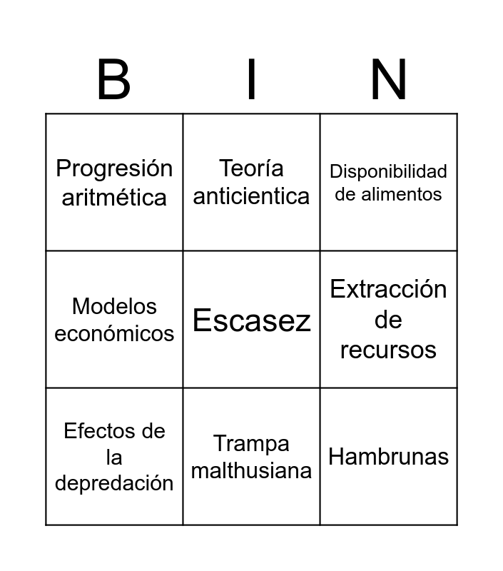 This bingo card has a free space and 8 words: Extracción de recursos, Disponibilidad de alimentos, Teoría anticientica, Efectos de la depredación, Progresión aritmética, Hambrunas, Modelos económicos and Trampa malthusiana.