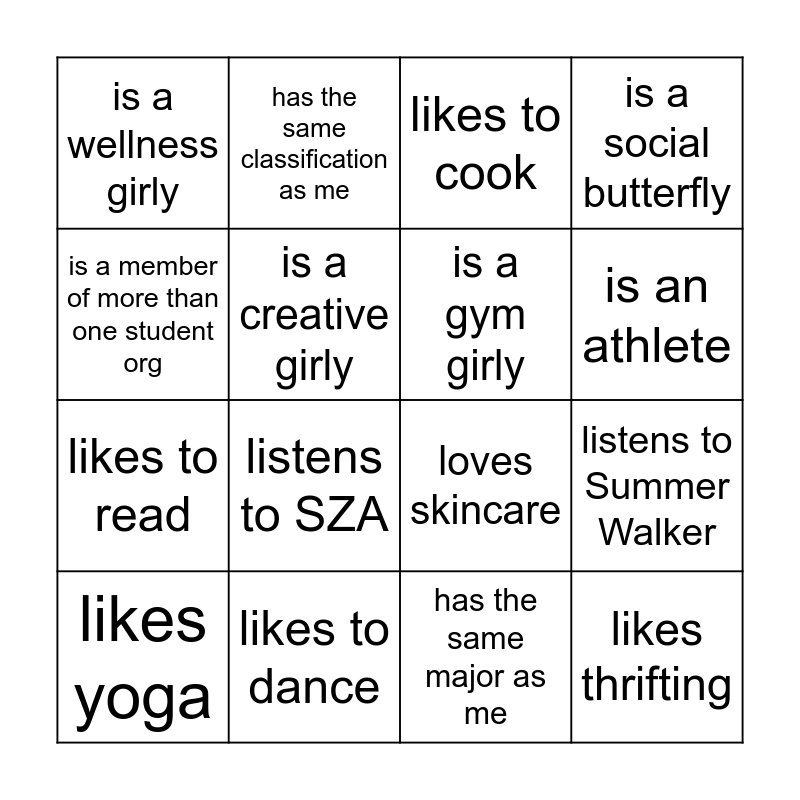 This bingo card has 1 images and 30 words: follows @blackgirlsneed on IG, shares the same birthday month as me, listens to Summer Walker, shares the same favorite music genre as me, is a wellness girly, likes to cook, is a gym girly, listens to Latto, likes to dance, is a business girly, has the same major as me, likes yoga, favorite color is green, loves fashion, listens to SZA, loves to get food and yap, is a homebody, is a marketing girly, likes thrifting, is a content girly, is a member of more than one student org, likes doing makeup, likes nature, has the same classification as me, likes to read, is a creative girly, is a social butterfly, loves skincare, shares the same comfort show/movie as me and is an athlete.