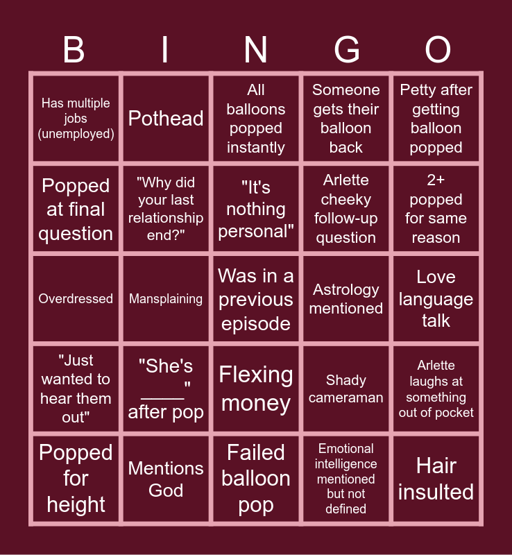 This bingo card has 40 words: Underdressed, Overdressed, Asking about baby daddies, "Why did your last relationship end?", Mentions God, Flexing money, "It's nothing personal", Wearing sunglasses indoors, Petty after getting balloon popped, "Just wanted to hear them out", Mansplaining, Someone gets their balloon back, Was in a previous episode, Love language talk, Astrology mentioned, "She's ____" after pop, Arlette fixing person's mic, Has multiple jobs (unemployed), Last two are long distance, All balloons popped instantly, Arlette laughs at something out of pocket, Emotional intelligence mentioned but not defined, Arlette cheeky follow-up question, Popped at final question, "Ideal first date?", Traditional values, Trash fit - man, Trash fit - woman, Hair insulted, "Not into bald men", Toes mentioned, Popped for height, Skin tone mentioned, Shady cameraman, 2+ popped for same reason, Failed balloon pop, Entrepreneur, WAGON, Pothead and "Being spontaneous".