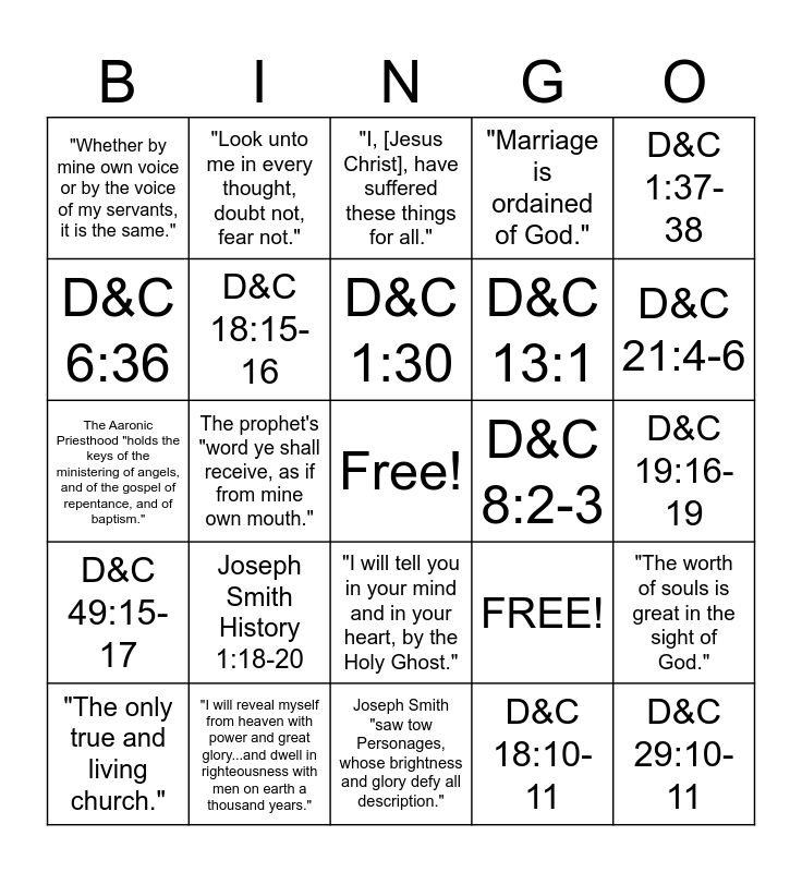 This bingo card has a free space and 25 words: Joseph Smith History 1:18-20, Joseph Smith "saw tow Personages, whose brightness and glory defy all description.", D&C 1:30, "The only true and living church.", D&C 1:37-38, "Whether by mine own voice or by the voice of my servants, it is the same.", D&C 6:36, "Look unto me in every thought, doubt not, fear not.", D&C 8:2-3, "I will tell you in your mind and in your heart, by the Holy Ghost.", D&C 13:1, The Aaronic Priesthood "holds the keys of the ministering of angels, and of the gospel of repentance, and of baptism.", FREE!, "The worth of souls is great in the sight of God.", D&C 18:15-16, "How great will be your joy if you should bring many souls unto me!", D&C 19:16-19, "I, [Jesus Christ], have suffered these things for all.", D&C 21:4-6, The prophet's "word ye shall receive, as if from mine own mouth.", D&C 29:10-11, "I will reveal myself from heaven with power and great glory...and dwell in righteousness with men on earth a thousand years.", D&C 49:15-17, "Marriage is ordained of God." and D&C 18:10-11.