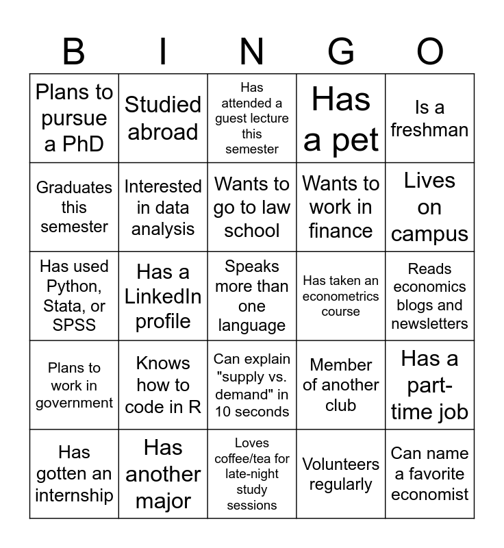 This bingo card has a free space and 24 words: Knows how to code in R, Has another major, Wants to go to law school, Has gotten an internship, Is a freshman, Plans to pursue a PhD, Graduates this semester, Studied abroad, Has taken an econometrics course, Can explain "supply vs. demand" in 10 seconds, Wants to work in finance, Has used Python, Stata, or SPSS, Member of another club, Has a part-time job, Interested in data analysis, Volunteers regularly, Reads economics blogs and newsletters, Has attended a guest lecture this semester, Lives on campus, Has a LinkedIn profile, Can name a favorite economist, Plans to work in government, Has a pet and Loves coffee/tea for late-night study sessions.