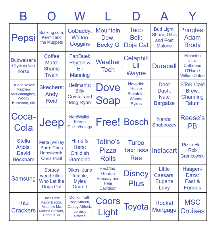 This bingo card has a free space and 51 words: Ritz Crackers, Duracell, Squarespace, Jeep, Hellman’s: Billy Crystal and Meg Ryan, Turbo Tax: Issa Rae, Booking.com: Kermit and the Muppets, Toyota, Bud Light: Shane Gillis and Post Malone, Instacart, Pringles: Adam Brody, Mountain Dew: Becky G, Door Dash: Nate Bargatze, Novartis: Hailee Steinfeld, Wanda Sykes, HexClad: Gordon Ramsay and Pete Davidson, Stella Artois: David Beckham, Budweiser's Clydesdale horse, Michelob Ultra: Catherine O'Hara / Willem Dafoe, Uber Eats: Kevin Bacon, Matthew Mc, Martha Stewart, Charli XCX, Taco Bell: Doja Cat, Cetaphil: Lil Wayne, NerdWallet: Kieran Culkin/beluga, Pepsi, Coffee Mate: Shania Twain, Dunkin' with Ben Affleck, Casey Affleck, Jeremy Strong, MSC Cruises, FanDuel: Peyton & Eli Manning, Coors Light, SToK Cold Brew: Channing Tatum, GoDaddy: Walton Goggins, Doritos: An alien abduction theme, Meta (w/Ray Ban): Chris Hemsworth, Chris Pratt, Oikos: Juno Temple, Myles Garrett, Disney Plus, Totino’s Pizza Rolls, Coca-Cola, Nerds: Shaboozey, Pizza Hut: Rob Gronkowski, Samsung, Spruce weed killer: Who Let the Dogs Out, True to Texas: Matthew McConaughey, Woody Harrelson, etc, Skechers: Andy Reid, Little Caesars: Eugene Levy, Rocket Mortgage, Bosch, Reese’s PB, Weather Tech, Hims & Hers: Childish Gambino, Haagen-Dazs: Fast & Furious, Dove Soap and Tubi.
