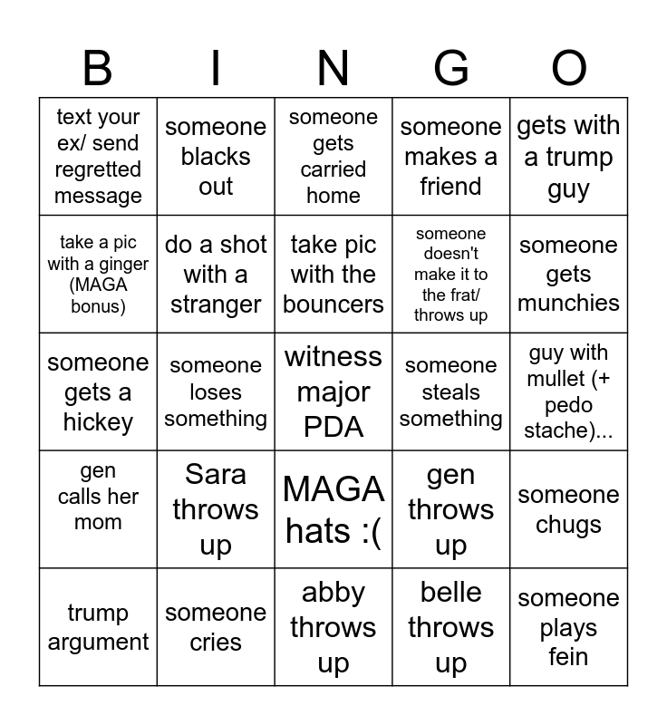 This bingo card has a free space and 24 words: Sara throws up, someone cries, take pic with the bouncers, trump argument, gets with a trump guy, text your ex/ send regretted message, take a pic with a ginger (MAGA bonus), someone blacks out, someone steals something, MAGA hats :(, someone doesn't make it to the frat/ throws up, someone gets a hickey, gen throws up, someone chugs, do a shot with a stranger, belle throws up, guy with mullet (+ pedo stache)..., someone gets carried home, someone gets munchies, someone loses something, someone plays fein, gen calls her mom, someone makes a friend and abby throws up.
