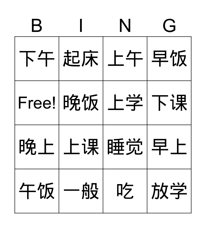 This bingo card has 16 words: 一般, 早上, 上午, 下午, 晚上, 起床, 睡觉, 吃, Free!, 晚饭, 午饭, 早饭, 上课, 下课, 上学 and 放学.