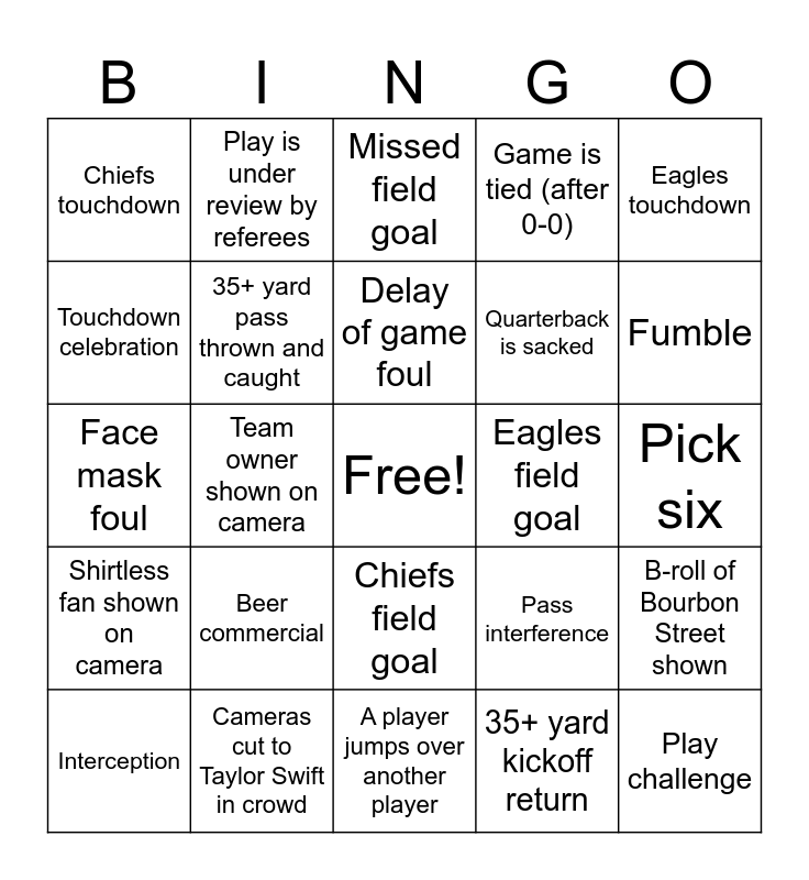 This bingo card has a free space and 24 words: Beer commercial, Cameras cut to Taylor Swift in crowd, Delay of game foul, Interception, Eagles touchdown, Chiefs touchdown, Touchdown celebration, Play is under review by referees, Eagles field goal, Chiefs field goal, Quarterback is sacked, Face mask foul, Pass interference, B-roll of Bourbon Street shown, 35+ yard pass thrown and caught, 35+ yard kickoff return, Pick six, Missed field goal, Fumble, Team owner shown on camera, Play challenge, Shirtless fan shown on camera, Game is tied (after 0-0) and A player jumps over another player.