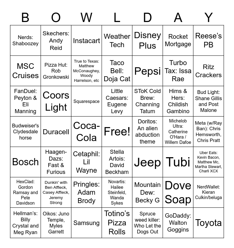 This bingo card has a free space and 51 words: Hellman’s: Billy Crystal and Meg Ryan, Turbo Tax: Issa Rae, Booking.com: Kermit and the Muppets, Duracell, Squarespace, Jeep, Skechers: Andy Reid, Spruce weed killer: Who Let the Dogs Out, Rocket Mortgage, Tubi, Reese’s PB, Weather Tech, Hims & Hers: Childish Gambino, SToK Cold Brew: Channing Tatum, Novartis: Hailee Steinfeld, Wanda Sykes, Bosch, MSC Cruises, Ritz Crackers, Oikos: Juno Temple, Myles Garrett, Disney Plus, Pepsi, Coca-Cola, Nerds: Shaboozey, Pizza Hut: Rob Gronkowski, Samsung, Toyota, True to Texas: Matthew McConaughey, Woody Harrelson, etc, Totino’s Pizza Rolls, Bud Light: Shane Gillis and Post Malone, Instacart, Door Dash: Nate Bargatze, Haagen-Dazs: Fast & Furious, Pringles: Adam Brody, Mountain Dew: Becky G, Stella Artois: David Beckham, Budweiser's Clydesdale horse, Michelob Ultra: Catherine O'Hara / Willem Dafoe, Uber Eats: Kevin Bacon, Matthew Mc, Martha Stewart, Charli XCX, HexClad: Gordon Ramsay and Pete Davidson, Dunkin' with Ben Affleck, Casey Affleck, Jeremy Strong, FanDuel: Peyton & Eli Manning, Coors Light, Dove Soap, GoDaddy: Walton Goggins, Doritos: An alien abduction theme, Meta (w/Ray Ban): Chris Hemsworth, Chris Pratt, Taco Bell: Doja Cat, Cetaphil: Lil Wayne, NerdWallet: Kieran Culkin/beluga, Little Caesars: Eugene Levy and Coffee Mate: Shania Twain.