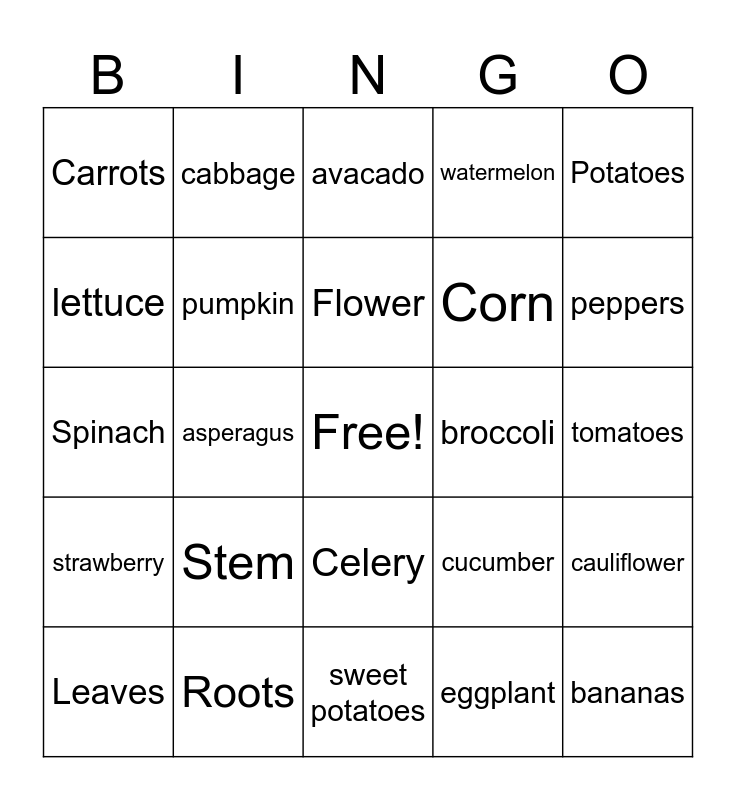 This bingo card has a free space and 24 words: Stem, Roots, Flower, Leaves, Potatoes, Carrots, lettuce, cabbage, broccoli, Celery, Corn, Spinach, cucumber, cauliflower, pumpkin, eggplant, tomatoes, avacado, peppers, asperagus, bananas, strawberry, watermelon and sweet potatoes.