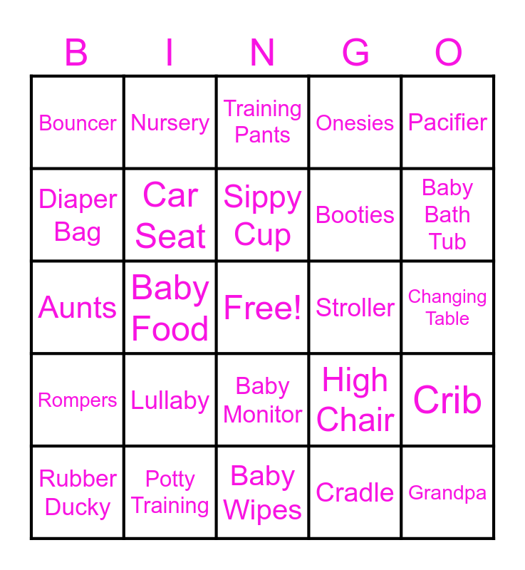 This bingo card has a free space and 48 words: Bassinet, Grandpa, Grandma, Baby Wipes, Lullaby, Baby Toy, Nursery, Bouncer, Diaper Bag, Stuffed Animals, Car Seat, Onesies, Crib, High Chair, Mommy, Daddy, Sippy Cup, Stroller, Blanket, Pacifier, Baby Food, Cradle, Bouncer, Booties, Family, Baby Bath Tub, Rubber Ducky, Baby Chicks, Baby Monitor, Rompers, Receiving Blanket, Due Date, Rocking Chair, Picture Books, Potty Training, Baby Swing, Ultrasound, Changing Table, Registry, I Love You, Stuffed Animals, Dolls, Training Pants, Safety Gate, Aunts, Uncles, Parents and Cousins.