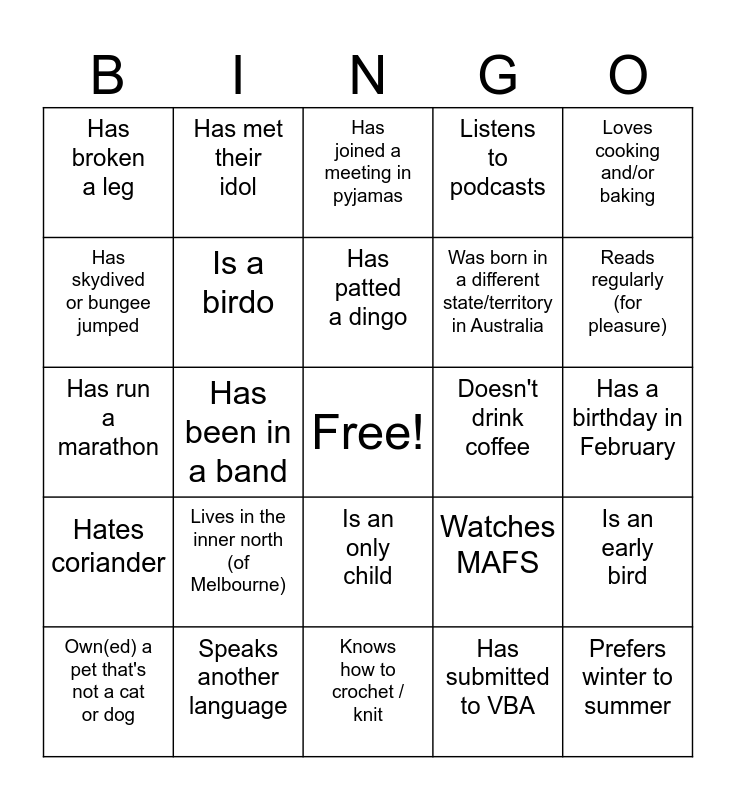 This bingo card has a free space and 24 words: Lives in the inner north (of Melbourne), Speaks another language, Has patted a dingo, Own(ed) a pet that's not a cat or dog, Loves cooking and/or baking, Has broken a leg, Has skydived or bungee jumped, Has met their idol, Doesn't drink coffee, Is an only child, Was born in a different state/territory in Australia, Has run a marathon, Watches MAFS, Is an early bird, Is a birdo, Has submitted to VBA, Has a birthday in February, Has joined a meeting in pyjamas, Reads regularly (for pleasure), Has been in a band, Prefers winter to summer, Hates coriander, Listens to podcasts and Knows how to crochet / knit.
