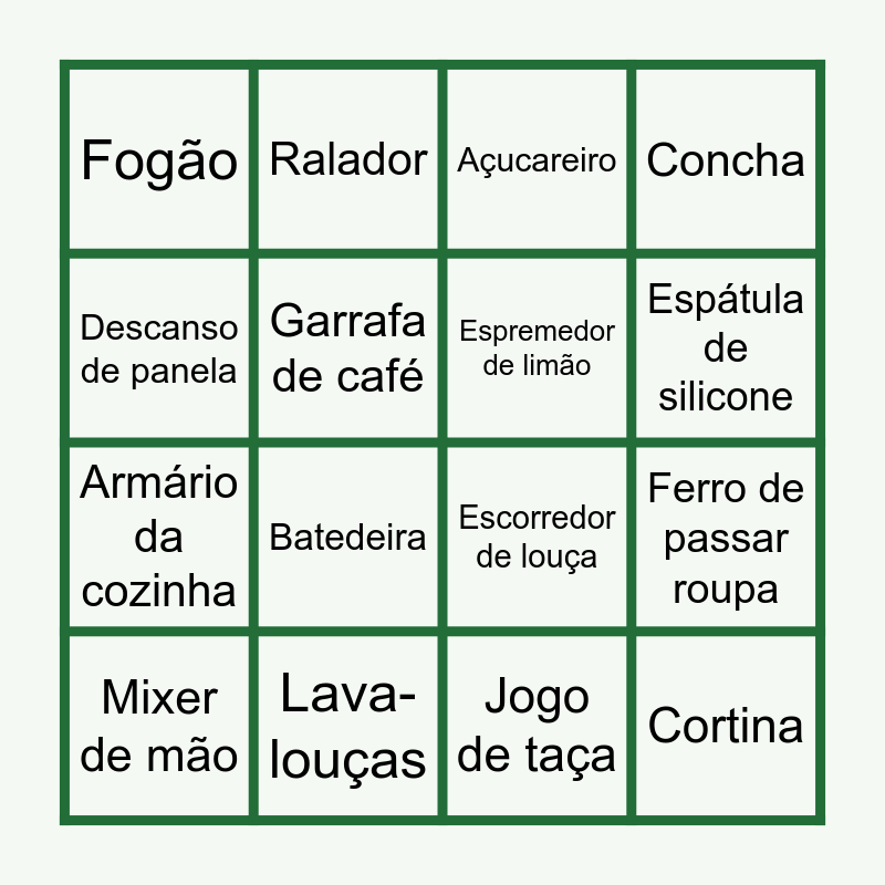 This bingo card has 80 words: Saleiro, Ar-condicionado, Açucareiro, Assadeira de vidro, Bandeja, Batedor de claras, Cafeteira elétrica, Chaleira elétrica, Conjunto de facas, Conjunto de panelas, Potes herméticos, Conjunto de travessas, Concha, Fogão, Saladeira, Garrafa de café, Tábua de cozinha, Tábua de passar roupa, Jogo de copos, Jogo de taça, Aparelho de jantar, Descanso de panela, Escorredor de louça, Espátula de silicone, Espremedor de limão, Forno elétrico, Forma de bolo, Frigideira antiaderente, Geladeira, Churrasqueira, Batedeira, Jarra de suco, Jogo de pratos, Jogo de talheres, Jogo de xícaras, Lava-louças, Máquina de lavar roupas, Liquidificador, Micro-ondas, Mixer de mão, Multiprocessador, Panela de pressão, Panela elétrica de arroz, Pegador de macarrão, Peneira, Ralador, Sanduicheira, Televisão, Torradeira, Air fryer, Aspirador de pó, Ferro de passar roupa, Abajur, Cabeceira de cama, Cadeiras, Cama box, Conjunto de toalhas, Edredom, Estante para sala, Guarda-roupa, Armário da cozinha, Jogo de cama, Sofá, Mesa de jantar, Rack para TV, Tapete, Toalha de mesa, Varal de roupas, Ventilador, Fruteira, Cortina, Kit para banheiro, Organizadores de gaveta, Passadeira de mesa, Espelho, Lixeira para cozinha, Suporte para papel toalha, Cesto para roupas, Luminária and Quadro decorativo.