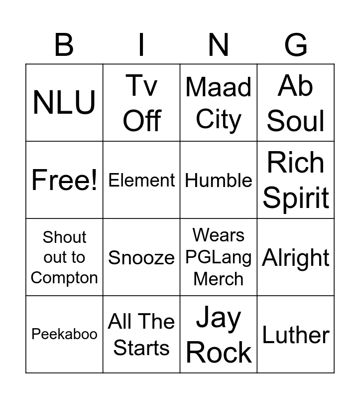 This bingo card has 16 words: All The Starts, Alright, Maad City, NLU, Shout out to Compton, Tv Off, Wears PGLang Merch, Jay Rock, Free!, Element, Peekaboo, Ab Soul, Snooze, Rich Spirit, Humble and Luther.