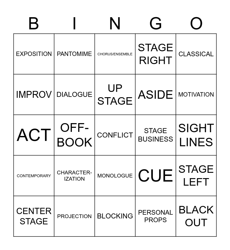 This bingo card has 30 words: PROJECTION, HAND PROPS, OFF-BOOK, COLD READ, EXPOSITION, CHORUS/ENSEMBLE, DIALOGUE, MONOLOGUE, STAGE BUSINESS, BLOCKING, SIGHT LINES, CONFLICT, PERSONAL PROPS, BLACK OUT, MOTIVATION, CALLBACK, CUE, CONTEMPORARY, CHARACTER-IZATION, CLASSICAL, ACT, SCENE, PANTOMIME, ASIDE, IMPROV, STAGE RIGHT, STAGE LEFT, CENTER STAGE, UP STAGE and DOWN STAGE.
