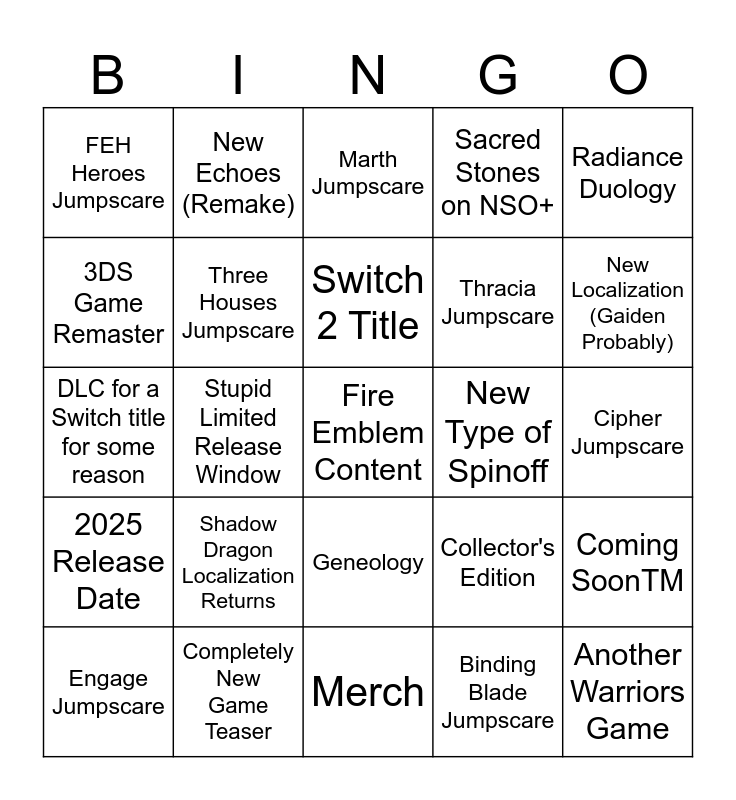 This bingo card has a free space and 24 words: Engage Jumpscare, Shadow Dragon Localization Returns, Switch 2 Title, Binding Blade Jumpscare, Radiance Duology, FEH Heroes Jumpscare, New Echoes (Remake), Marth Jumpscare, New Type of Spinoff, Cipher Jumpscare, DLC for a Switch title for some reason, Three Houses Jumpscare, Collector's Edition, Coming SoonTM, 3DS Game Remaster, Completely New Game Teaser, Merch, Sacred Stones on NSO+, New Localization (Gaiden Probably), 2025 Release Date, Stupid Limited Release Window, Geneology, Thracia Jumpscare and Another Warriors Game.