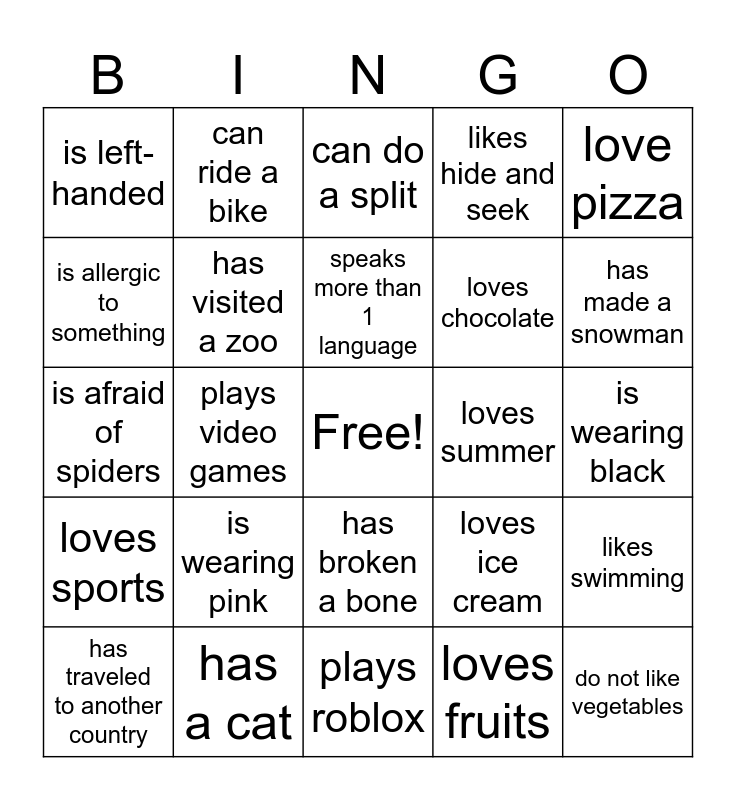 This bingo card has a free space and 24 words: is wearing pink, has a cat, speaks more than 1 language, has traveled to another country, love pizza, is left-handed, is allergic to something, can ride a bike, loves summer, has broken a bone, loves chocolate, is afraid of spiders, loves ice cream, likes swimming, has visited a zoo, loves fruits, is wearing black, can do a split, has made a snowman, plays video games, do not like vegetables, loves sports, likes hide and seek and plays roblox.