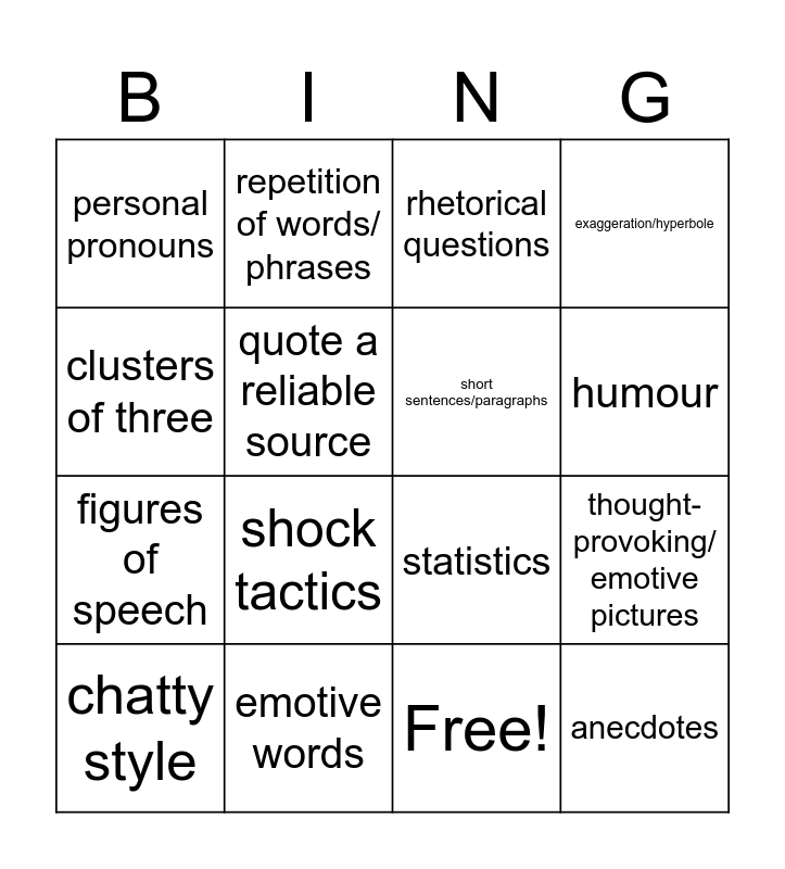 This bingo card has 17 words: Free!, chatty style, rhetorical questions, personal pronouns, shock tactics, exaggeration/hyperbole, thought-provoking/ emotive pictures, short sentences/paragraphs, humour, quote a reliable source, emotive words, statistics, clusters of three, repetition of words/ phrases, figures of speech, catchy phrases or slogans and anecdotes.