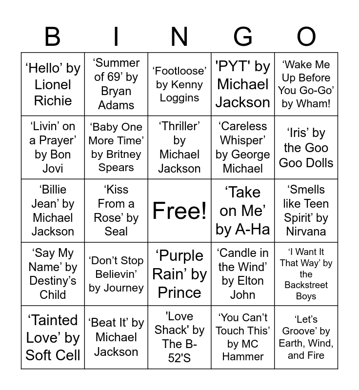 This bingo card has a free space and 24 words: ‘Don’t Stop Believin’ by Journey, ‘Beat It’ by Michael Jackson, ‘Thriller’ by Michael Jackson, ‘Tainted Love’ by Soft Cell, ‘Wake Me Up Before You Go-Go’ by Wham!, ‘Hello’ by Lionel Richie, ‘Livin’ on a Prayer’ by Bon Jovi, ‘Summer of 69’ by Bryan Adams, ‘Take on Me’ by A-Ha, ‘Purple Rain’ by Prince, ‘Careless Whisper’ by George Michael, ‘Billie Jean’ by Michael Jackson, ‘Candle in the Wind’ by Elton John, ‘I Want It That Way’ by the Backstreet Boys, ‘Baby One More Time’ by Britney Spears, ‘You Can’t Touch This’ by MC Hammer, ‘Smells like Teen Spirit’ by Nirvana, ‘Footloose’ by Kenny Loggins, ‘Iris’ by the Goo Goo Dolls, ‘Kiss From a Rose’ by Seal, ‘Let’s Groove’ by Earth, Wind, and Fire, ‘Say My Name’ by Destiny’s Child, 'PYT' by Michael Jackson and 'Love Shack' by The B-52'S.