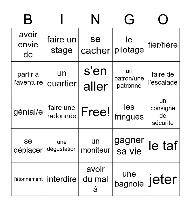 This bingo card has a free space and 24 words: une dégustation, interdire, s'en aller, l'étonnement, fier/fière, avoir envie de, partir à l'aventure, faire un stage, les fringues, un moniteur, un patron/une patronne, génial/e, gagner sa vie, le taf, un quartier, une bagnole, un consigne de sécurite, se cacher, faire de l'escalade, faire une radonnée, jeter, se déplacer, le pilotage and avoir du mal à.