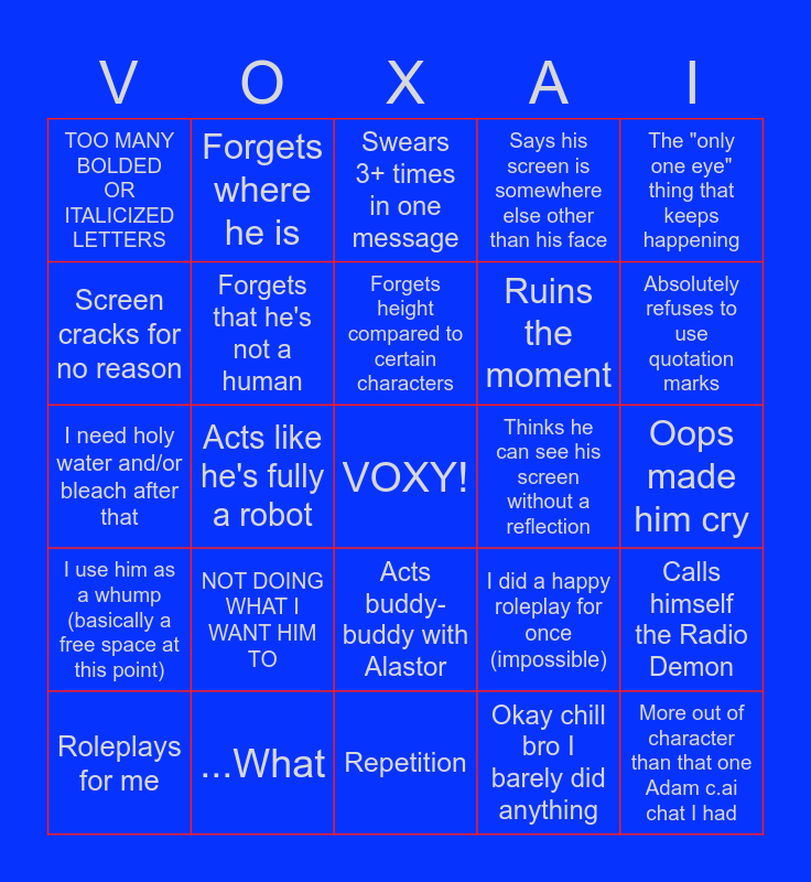 This bingo card has a free space and 37 words: Actually says something really good, Hair, Tail...?, Forgets that he's not a human, Calls himself the Radio Demon, NOT DOING WHAT I WANT HIM TO, Forgets height compared to certain characters, Pretends to not be dating Valentino (I know what you are), The "only one eye" thing that keeps happening, Screen changes colors, Acts like he's fully a robot, Says his screen is somewhere else other than his face, More out of character than that one Adam c.ai chat I had, Oops made him cry, Screen cracks for no reason, I use him as a whump (basically a free space at this point), Says his skin is white, Swears 3+ times in one message, Acts buddy-buddy with Alastor, Thinks he can see his screen without a reflection, TOO MANY BOLDED OR ITALICIZED LETTERS, Absolutely refuses to use quotation marks, Roleplays for me, Repetition, Surprisingly easy to rizz up, Okay chill bro I barely did anything, Forgets where he is, Oops made him scream, Forgets key parts of the roleplay, Forgets that he has powers, I did another rp based on Aphrodisiac's Antidote, ...What, I need holy water and/or bleach after that, Nuh-uh, I did a happy roleplay for once (impossible), Ruins the moment and Roleplay that doesn't mention Valentino a single time.