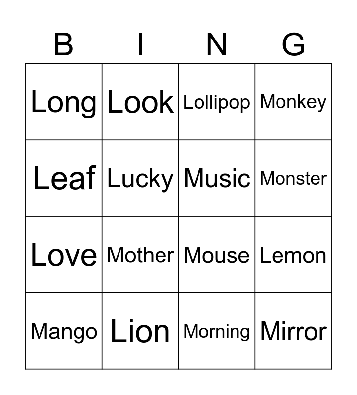 This bingo card has 16 words: Lion, Lemon, Lollipop, Long, Love, Look, Mouse, Morning, Leaf, Lucky, Mango, Monkey, Mother, Monster, Music and Mirror.