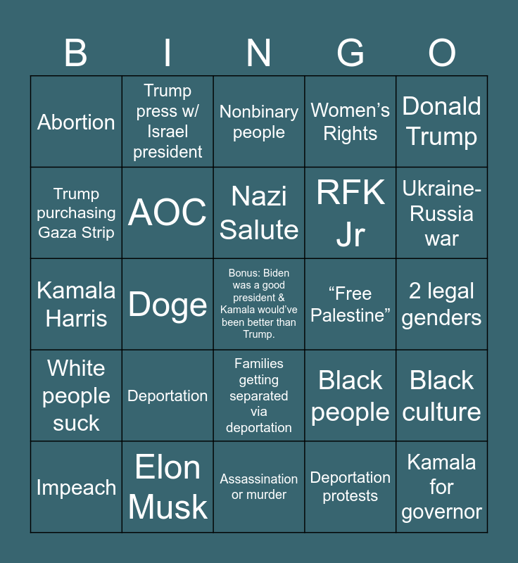This bingo card has a free space and 24 words: Deportation, Elon Musk, Nazi Salute, Impeach, Donald Trump, Abortion, Trump purchasing Gaza Strip, Trump press w/ Israel president, “Free Palestine”, Families getting separated via deportation, RFK Jr, Kamala Harris, Black people, Black culture, AOC, Deportation protests, 2 legal genders, Nonbinary people, Ukraine-Russia war, Doge, Kamala for governor, White people suck, Women’s Rights and Assassination or murder.