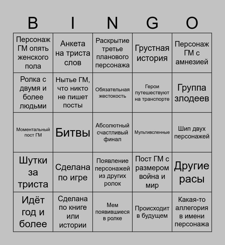 This bingo card has a free space and 24 words: Сделана по игре, Сделана по книге или истории, Обязательная жестокость, Идёт год и более, Персонаж ГМ с амнезией, Персонаж ГМ опять женского пола, Ролка с двумя и более людьми, Анкета на триста слов, Мультивсленные, Появление персонажей из других ролок, Герои путешествуют на транспорте, Моментальный пост ГМ, Пост ГМ с размером война и мир, Другие расы, Нытье ГМ, что никто не пишет посты, Происходит в будущем, Шип двух персонажей, Раскрытие третье планового персонажа, Группа злодеев, Битвы, Какая-то аллегория в имени персонажа, Шутки за триста, Грустная история and Мем появившиеся в ролке.