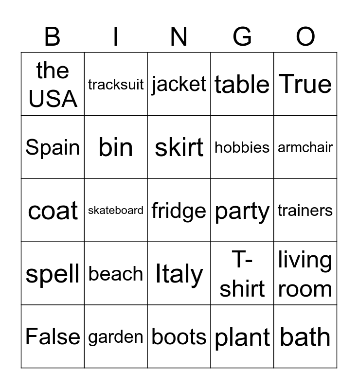 This bingo card has a free space and 34 words: games console, plant, language, the UK, spell, bin, True, False, tracksuit, shirt, skirt, jacket, cushion, carpet, party, armchair, garden, coat, beach, T-shirt, Italy, wall, the USA, trainers, boots, bath, table, floor, hobbies, Spain, hoodie, skateboard, living room and lamp.