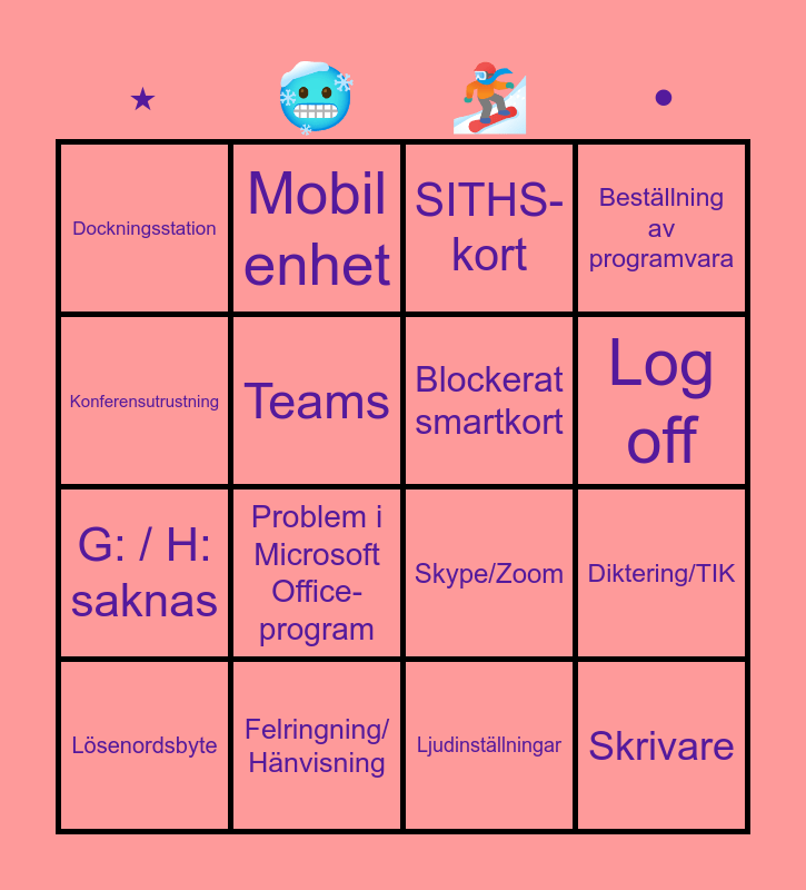 This bingo card has 29 words: Free!, Cosmic support/användarstöd, Diktering/TIK, CAP/FAS, Dockningsstation, SITHS-kort, Blockerat smartkort, FO laboratorium ärende, Felringning/ Hänvisning, Problem med installation (OS / program), Ljudinställningar, Lösenordsbyte, MTDC ärende, Cosmic Mediahanterare, Problem i Microsoft Office-program, Nätverk, Bildskärm, Skrivare, Konferensutrustning, Skype/Zoom, Statusförfrågan, VPN/domän, G: / H: saknas, Teams, Beställning av programvara, Mobil enhet, Frenda, Log off and Visningsläge i Office.