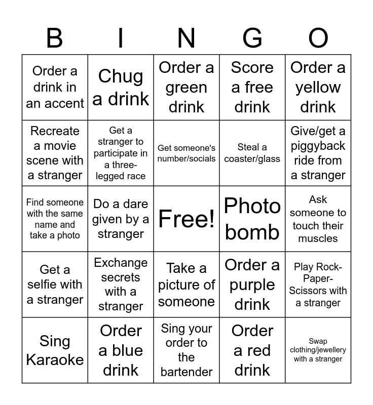 This bingo card has a free space and 34 words: Do a shot with a stranger, Order a red drink, Start a Congo line, Finish a drink without using your hands/straw, Get a selfie with a stranger, Get a stranger to participate in a three-legged race, Order a yellow drink, Sing Karaoke, Chug a drink, Take a picture with someone working, Get someone's number/socials, Order a green drink, Give an inspirational speech, Do a shot, Photo bomb, Give/get a piggyback ride from a stranger, Order a blue drink, Find someone with the same name and take a photo, Exchange secrets with a stranger, Order a purple drink, Take a picture of someone, Tell a stranger a pickup line, Order a drink in an accent, Ask someone to touch their muscles, Sing your order to the bartender, Swap clothing/jewellery with a stranger, Score a free drink, Ask a stranger for a signature, Steal a coaster/glass, Recreate a movie scene with a stranger, Challenge a stranger to a dance-off, Do a dare given by a stranger, Play Rock-Paper-Scissors with a stranger and Approach a stranger as if you know them.