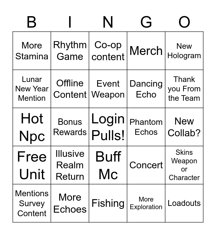 This bingo card has a free space and 24 words: Mentions Survey Content, Illusive Realm Return, Event Weapon, More Exploration, New Hologram, More Stamina, Rhythm Game, Co-op content, Phantom Echos, New Collab?, Hot Npc, Offline Content, Concert, Skins Weapon or Character, Lunar New Year Mention, More Echoes, Fishing, Merch, Thank you From the Team, Free Unit, Bonus Rewards, Buff Mc, Dancing Echo and Loadouts.