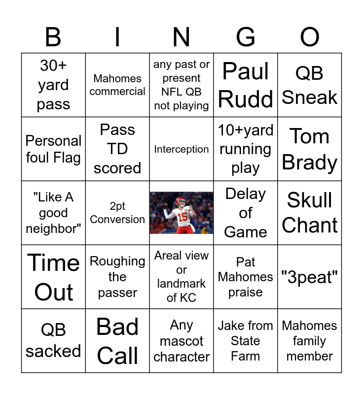 This bingo card has a free space and 24 words: Roughing the passer, Bad Call, Interception, QB sacked, QB Sneak, 30+ yard pass, Personal foul Flag, Mahomes commercial, Delay of Game, Areal view or landmark of KC, 10+yard running play, "Like A good neighbor", Pat Mahomes praise, "3peat", Pass TD scored, Jake from State Farm, Skull Chant, any past or present NFL QB not playing, Tom Brady, 2pt Conversion, Mahomes family member, Time Out, Paul Rudd and Any mascot character.